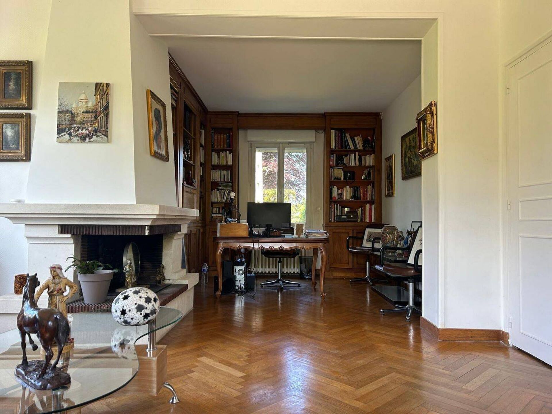 •Salon chaleureux avec un parquet bâton rompu authentique, idéal pour des moments de détente.