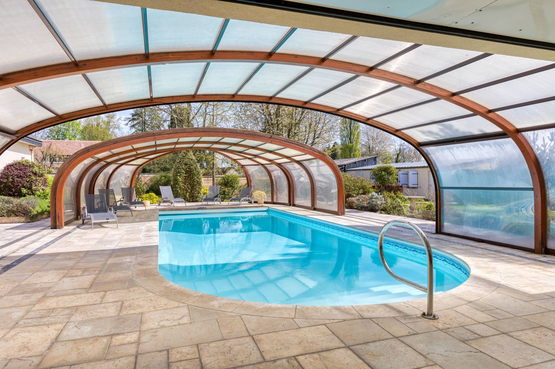 - Piscine de 12X5m couverte d’un dôme retractable profitable toute l’année, chauffée par pompe à chaleur et traitée au sel par électrolyse.