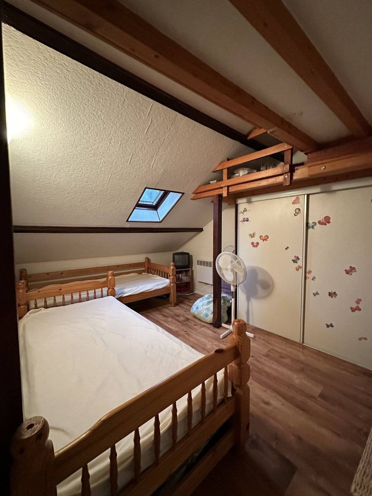 L'appartement comprend un palier d'entrée, une salle à manger/salon lumineuse, une cuisine équipée et fonctionnelle, une chambre avec une penderie et une petite mezzanine ainsi qu'une salle d'eau avec WC. Profitez d'une vue imprenable sur les toits depuis cet appartement au dernier étage.