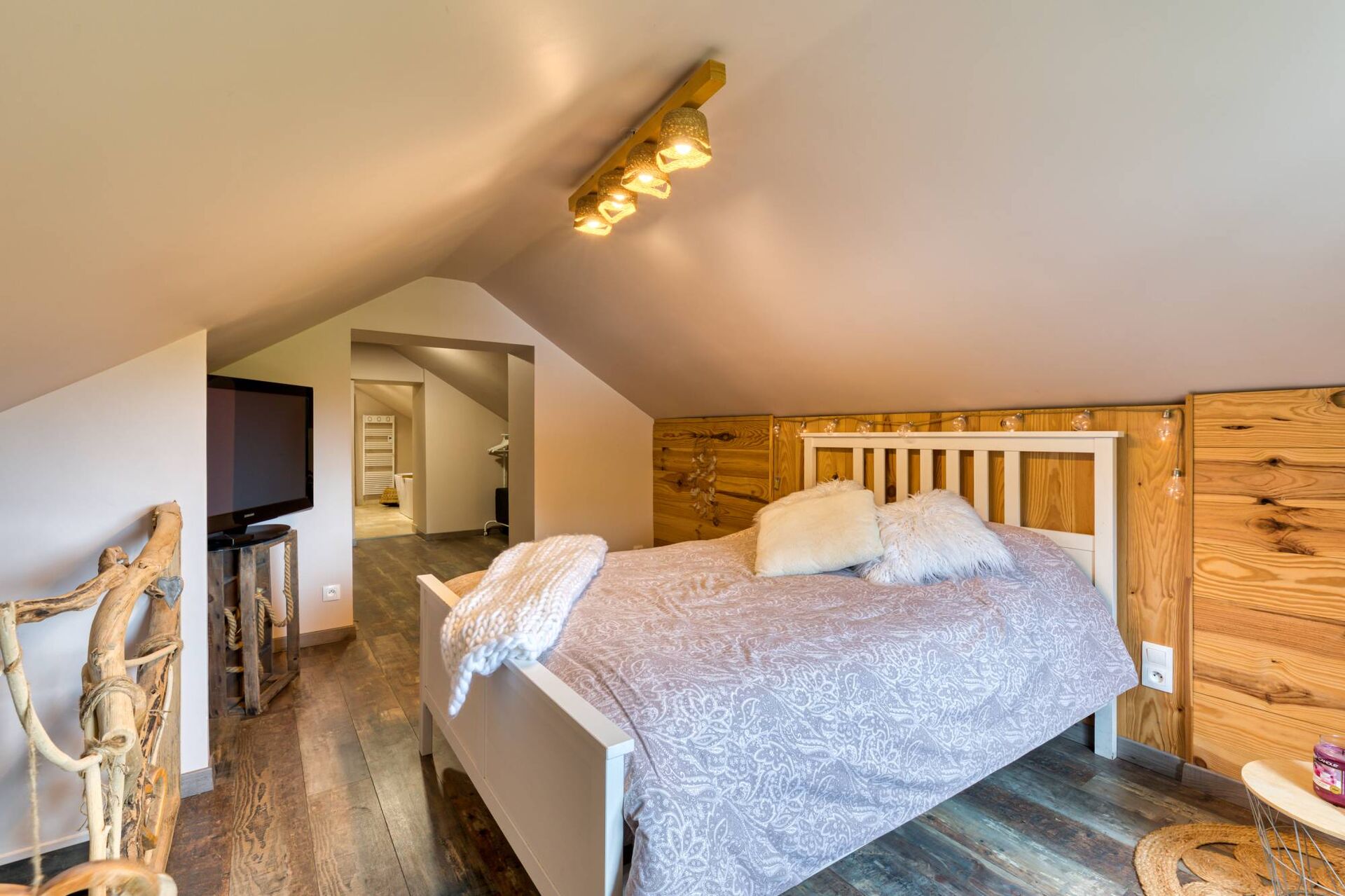 À l'étage, une suite parentale s'étend sur toute la surface, comprenant une chambre spacieuse, une salle de bains avec WC et un dressing.